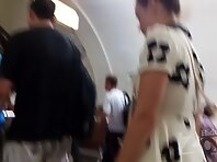 Under the skirt of a tanned girl in a white sundress. Our cameraman stuck his hand with the camera under her skirt several times. Round tanned ass and shaved crotch in white panties close-up. A great model for shooting upskirt in the subway.